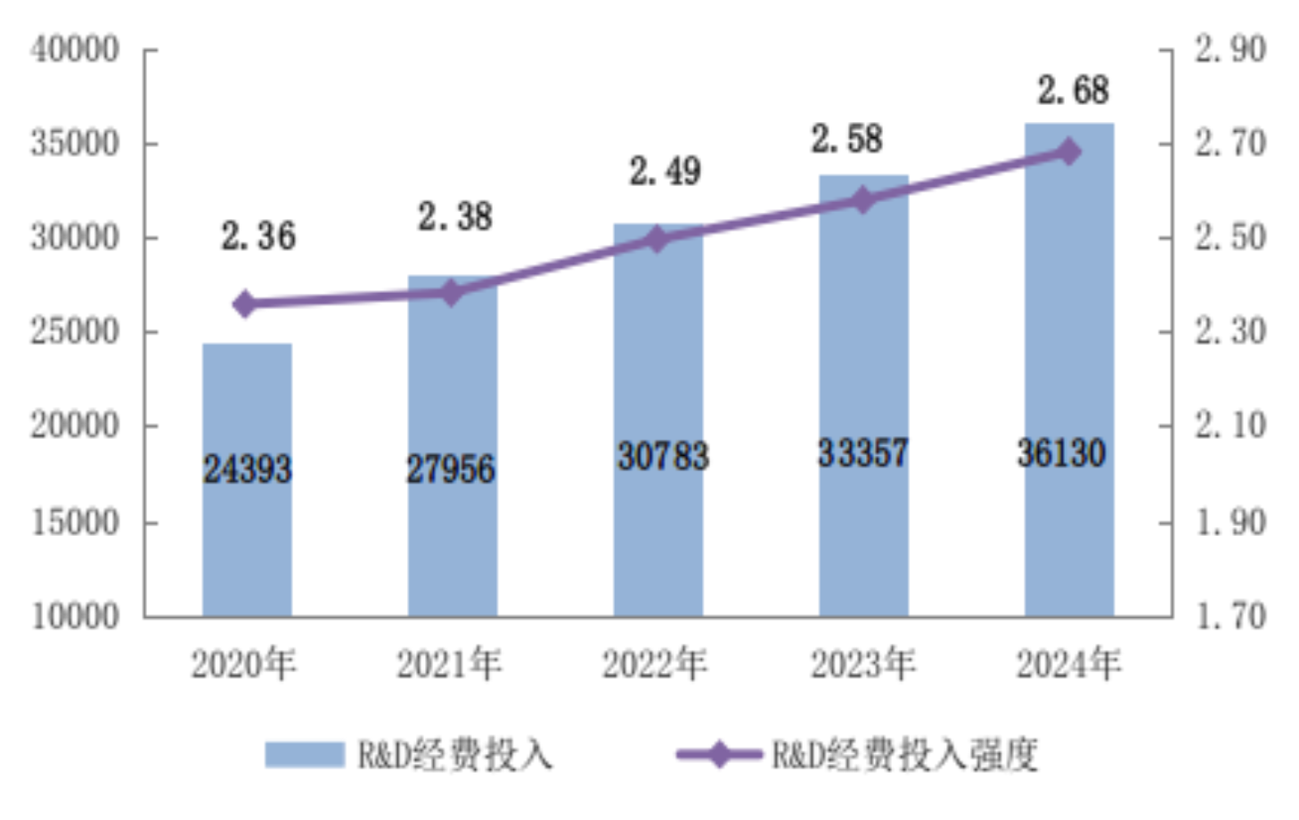 據(jù)國(guó)家統(tǒng)計(jì)局?jǐn)?shù)據(jù),初步測(cè)算,2024年我國(guó)全社會(huì)研究與試驗(yàn)發(fā)展(R&D)經(jīng)費(fèi)投入超過(guò)3.6萬(wàn)億元,為36130億元,比上年增長(zhǎng)8.3%;研究與試驗(yàn)發(fā)展(R&D)經(jīng)費(fèi)投入強(qiáng)度(指研究與試驗(yàn)發(fā)展經(jīng)費(fèi)與國(guó)內(nèi)生產(chǎn)總值之比)達(dá)到2.68%,比上年提高0.10個(gè)百分點(diǎn)。其中,基礎(chǔ)研究經(jīng)費(fèi)為2497億元,增長(zhǎng)10.5%;占研究與試驗(yàn)發(fā)展(R&D)經(jīng)費(fèi)比重為6.91%,提升0.14個(gè)百分點(diǎn)。