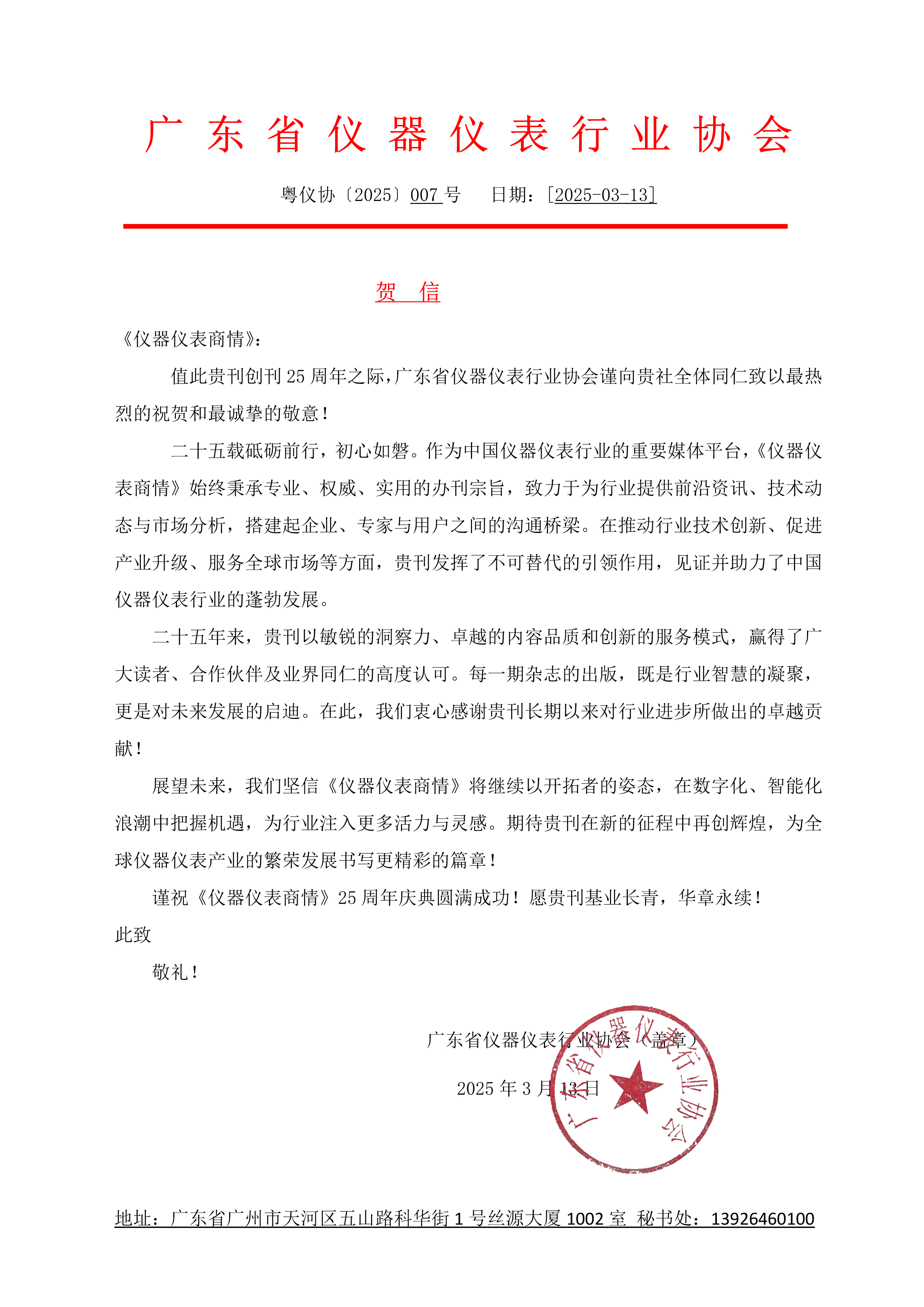 在《儀器儀表商情》創(chuàng)刊25周年之際,收到廣東省儀器儀表行業(yè)協(xié)會(huì)的致賀,感謝協(xié)會(huì)的認(rèn)可與期待。未來(lái),《儀器儀表商情》將繼續(xù)與協(xié)會(huì)攜手,共啟行業(yè)新程。
