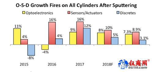 在2017年,光電子銷售從2016年罕見的下滑4%,一舉恢復增長9%,達到369億美元。而傳感器/執(zhí)行機構的市場份額連續(xù)第二年增長16%,攀升至138億美元。而分立器件增長顯著,同比增長12%,達到246億美元。最新的O-S-D報告預測顯示,2018年光電器件銷售將增長8%,傳感器/制動器增長10%,而分立器件則增長5%。