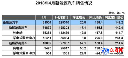本周,中汽協(xié)與中國充電聯(lián)盟相繼發(fā)布新能源汽車市場數(shù)據(jù)。根據(jù)中汽協(xié)發(fā)布2018年4月份汽車產(chǎn)銷數(shù)據(jù)顯示,今年4月新能源汽車產(chǎn)銷量分別為8.1萬輛和8.2萬輛,同比增長分別為117.7%和138.4%;1-4月累計銷售新能源汽車22.5萬輛,同比增長149.2%。