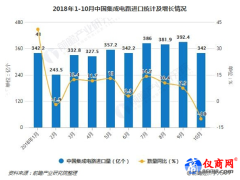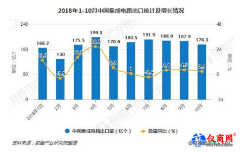 據(jù)前瞻產(chǎn)業(yè)研究院發(fā)布的《集成電路行業(yè)市場(chǎng)需求預(yù)測(cè)與投資戰(zhàn)略規(guī)劃分析報(bào)告》統(tǒng)計(jì)數(shù)據(jù)顯示,2018年6-10月全國(guó)集成電路產(chǎn)量連續(xù)4個(gè)月持續(xù)下降,2018年10月全國(guó)集成電路產(chǎn)量下降幅度增大,2018年10月全國(guó)集成電路產(chǎn)量為130.1億塊,同比下降7.3%。2018年1-10月全國(guó)集成電路產(chǎn)量為1421.2億塊,同比增長(zhǎng)9.8%。