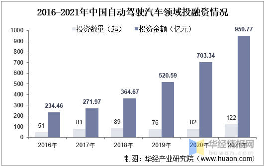 2016-2021年中國(guó)自動(dòng)駕駛汽車領(lǐng)域投融資情況
