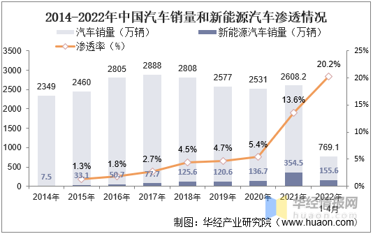 2014-2022年中國(guó)汽車銷量及新能源汽車滲透情況