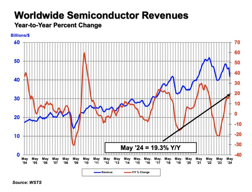 半導(dǎo)體行業(yè)協(xié)會(huì) (SIA) 今天宣布,2024 年 5 月全球半導(dǎo)體行業(yè)銷售額達(dá)到 491 億美元,與 2023 年 5 月的 412 億美元相比增長 19.3%,與 2024 年 4 月的 472 億美元相比增長 4.1%。
