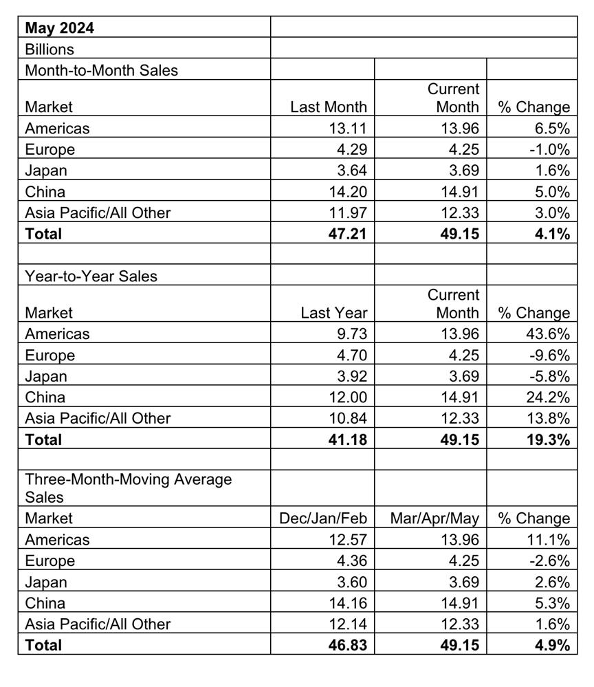 從地區(qū)來看,美洲(43.6%)、中國(24.2%)和亞太/所有其他地區(qū)(13.8%)的銷售額同比上漲,但日本(-5.8%)和歐洲(-9.6%)的銷售額下降。5 月份,美洲(6.5%)、中國(5.0%)、亞太/所有其他地區(qū)(3.0%)和日本(1.6%)的銷售額環(huán)比上漲,但歐洲(-1.0%)的銷售額下降。