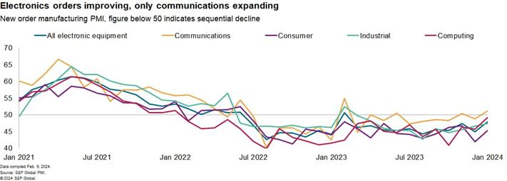 從上而下來看,半導(dǎo)體需求疲軟,電子設(shè)備制造業(yè)低迷。標(biāo)普全球制造業(yè)采購經(jīng)理人指數(shù) 顯示,過去 19 個(gè)月中,新訂單有 18 個(gè)月處于下降趨勢。
