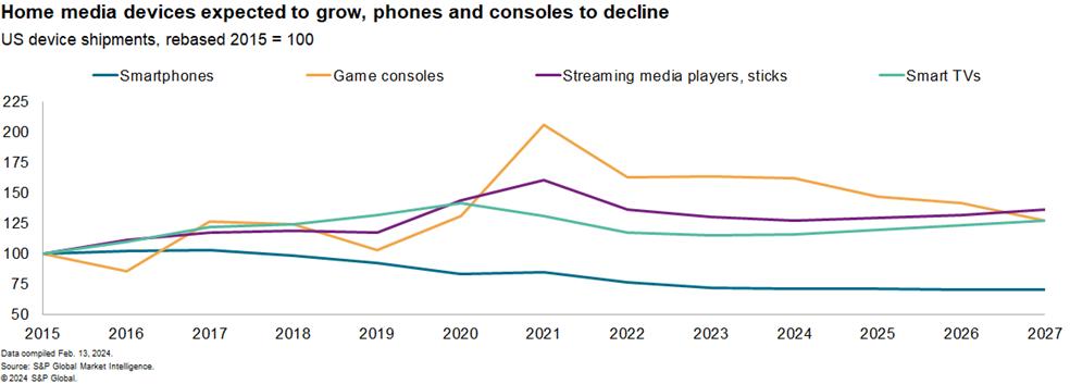 短期來看,我們的預(yù)測顯示,自 2016 年以來,北美智能手機(jī)出貨量一直處于持續(xù)下滑狀態(tài),預(yù)計(jì)到 2027 年都不會(huì)復(fù)蘇。包括視頻游戲機(jī)、電視和流媒體在內(nèi)的家庭媒體設(shè)備的出貨量在 2020 年增長了 16%,在 2021 年增長了 10%,然后在 2022 年和 2023 年合計(jì)下滑了 17%。游戲機(jī)出貨量預(yù)計(jì)將下降,而流媒體和智能電視預(yù)計(jì)在未來四年僅增長 1% 至 3%。