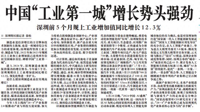 進(jìn)入2024年,深圳制造業(yè)繼續(xù)保持強(qiáng)勁的增長(zhǎng)勢(shì)頭,今年前5個(gè)月,深圳規(guī)模以上工業(yè)增加值同比增長(zhǎng)12.3%,領(lǐng)先優(yōu)勢(shì)進(jìn)一步擴(kuò)大。
