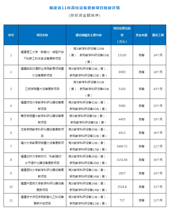 福建省的11所高校和職業(yè)院校近期集中發(fā)布了重大教學(xué)科研儀器設(shè)備更新項(xiàng)目的建議書和可行性研究報(bào)告。這些高校計(jì)劃自籌5.33億元人民幣,用于淘汰592臺(tái)(套)教學(xué)科研設(shè)備,并新購285臺(tái)(套)教學(xué)科研設(shè)備。這些項(xiàng)目的建設(shè)工期不等,最短為12個(gè)月,最長為43個(gè)月。例如,福建師范大學(xué)的項(xiàng)目包括淘汰42臺(tái)(套)教學(xué)科研設(shè)備,并新購42臺(tái)(套)設(shè)備,總投資估算為5060萬元,建設(shè)工期為15個(gè)月。