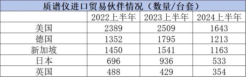 數(shù)據(jù)顯示2022年上半年、2023年上半年、2024年上半年,質(zhì)譜進(jìn)口貿(mào)易地區(qū)排名前五的均為美國(guó)、德國(guó)、新加坡、日本、英國(guó)。僅從2024年上半年進(jìn)口數(shù)量來(lái)看,美國(guó)1643臺(tái)套,占比29.5%,德國(guó)1213臺(tái)套,占比21.8%,新加坡1163臺(tái)套,占比20.9%。從上述三個(gè)國(guó)家進(jìn)口數(shù)量總占比72.2%。