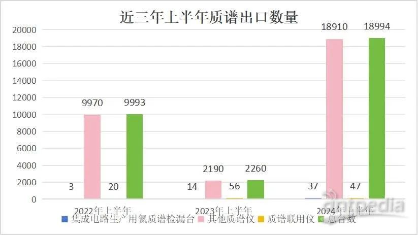 近三年上半年質(zhì)譜儀出口數(shù)量呈上升趨勢(shì),其中,集成電路生產(chǎn)用氦質(zhì)譜檢漏臺(tái)從2022年上半年的3臺(tái)增加至2024年上半年的37臺(tái)套。其他質(zhì)譜儀出口數(shù)量尤為明顯,質(zhì)譜聯(lián)用儀2024年上半年出口較2023年上半年有所下降,但較于2022年的20臺(tái)套,增加至47臺(tái)套。