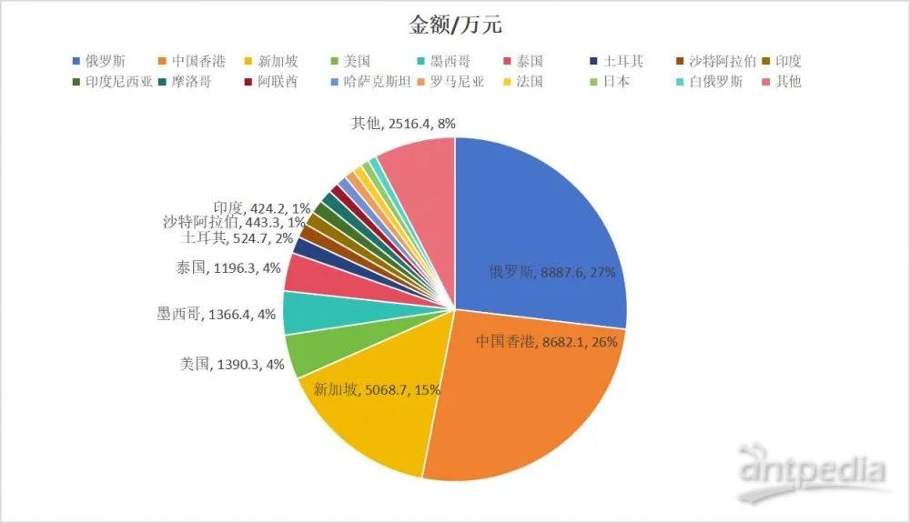 2024年上半年質(zhì)譜儀出口金額3.3億元,排名前五的國(guó)家/地區(qū),俄羅斯8887.6萬(wàn)元,銷(xiāo)往中國(guó)香港8682.1萬(wàn)元,新加坡5068.7萬(wàn)元,美國(guó)1390.3萬(wàn)元,墨西哥1366.4萬(wàn)元。