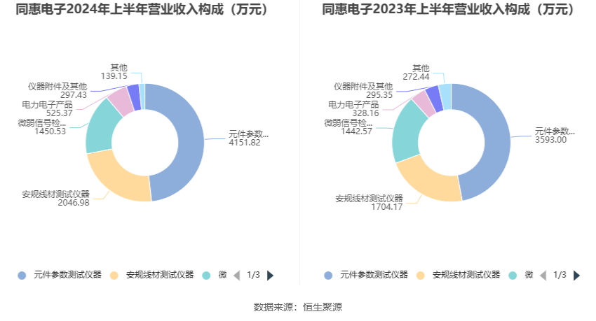 分產(chǎn)品來看,2024年上半年公司主營業(yè)務(wù)中,元件參數(shù)測(cè)試儀器收入4151.82萬元,同比增長15.55%,占營業(yè)收入的48.21%;安規(guī)線材測(cè)試儀器收入2046.98萬元,同比增長20.12%,占營業(yè)收入的23.77%;微弱信號(hào)檢測(cè)儀器收入1450.53萬元,同比增長0.55%,占營業(yè)收入的16.84%。