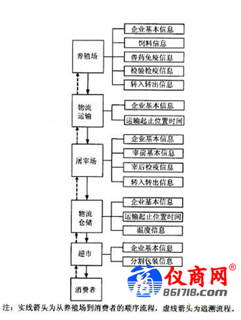 動物食品安全溯源系統(tǒng)包括從“養(yǎng)殖場”到“消費(fèi)者”的諸多環(huán)節(jié),主要有:養(yǎng)殖場、運(yùn)輸物流、屠宰場、物流倉儲、超市和消費(fèi)者6個(gè)環(huán)節(jié)。