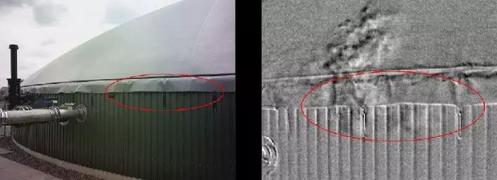 然而,在儲(chǔ)罐與頂棚、內(nèi)部氣膜、潛水混合器的小孔或儲(chǔ)罐壁上的孔的連接處,使用泄漏噴霧和傳感器是非常困難,甚至是不可能。使用這些工具對(duì)整個(gè)沼氣設(shè)施進(jìn)行檢測(cè)不僅耗時(shí),整體成本也會(huì)相對(duì)提高,而且攜帶它們攀爬沼氣存儲(chǔ)裝置,對(duì)檢測(cè)人員的安全也有一定的威脅!