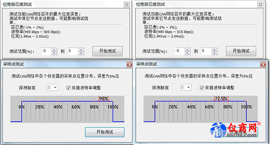 在兩個(gè)緩沖段中間的位置,即是讀取總線電平的采樣點(diǎn)位置,當(dāng)檢測(cè)到總線上存在相位差的時(shí)候,通過(guò)延長(zhǎng)BS1段或縮短BS2段來(lái)獲得同步,這樣的方式稱為重新同步。這兩個(gè)相位緩沖段的延長(zhǎng)時(shí)間或縮短時(shí)間上限由再同步跳轉(zhuǎn)寬度(SJW)給定。采樣點(diǎn)是接收節(jié)點(diǎn)判斷信號(hào)邏輯的位置,CAN通訊屬于異步通訊,需要通過(guò)不斷的重新同步才能保證收發(fā)節(jié)點(diǎn)的采樣準(zhǔn)確,所以SJW(同步跳轉(zhuǎn)寬度)決定了接收節(jié)點(diǎn)是否能有比較好的兼容性。如下圖,即是某CAN總線中利用致遠(yuǎn)電子CANscope進(jìn)行的采樣點(diǎn)與位寬度容忍的快速測(cè)試結(jié)果: