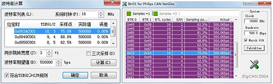 波特率計(jì)算時(shí),提高適應(yīng)范圍,需要保證12-20(特征16)個(gè)的位時(shí)間因子,然后通過(guò)提高正常節(jié)點(diǎn)波特率寄存器中的同步跳轉(zhuǎn)寬度SJW值(加大到2-3個(gè)單位時(shí)間)來(lái)實(shí)現(xiàn)。比如使用廣州致遠(yuǎn)電子兩款波特率計(jì)算工具,可以計(jì)算出良好的波特率寄存器值。