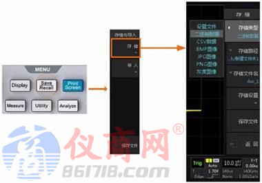 存儲(chǔ)方式:【Print Screen】(一鍵存儲(chǔ))、【Save/Recall】(存儲(chǔ))、PC聯(lián)機(jī)截圖、以及ScopeReport TM;