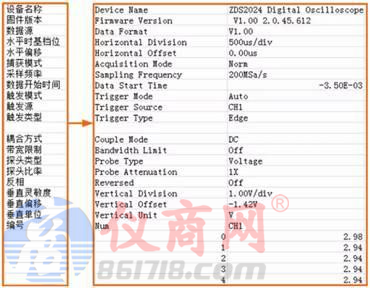ZDS2000系列示波器的CSV數(shù)據(jù)文件里,包含設(shè)備信息、水平檔位、水平偏移等信息,如圖2所示。