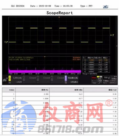 ScopeReport TM功能可以對(duì)所有的協(xié)議解碼和FFT的頻譜分析結(jié)果進(jìn)行“打包”處理,自動(dòng)生成html或者csv文件格式的報(bào)告,保存在本地閃存和外部存儲(chǔ)器U盤中,用戶可以以報(bào)表的形式進(jìn)行查看;