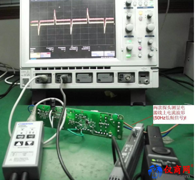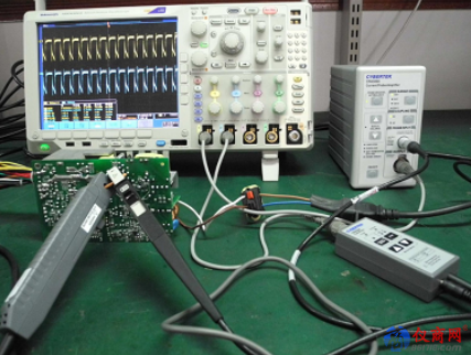 開關(guān)電源的開關(guān)頻率可以達到 100KHZ,當(dāng)然還有更高的,瞬間的上升速度達到 NS 級別,如果使用低頻電流嵌(US 級別,如本公司的 CP8100L,泰克的 A622),根本無法準確捕捉波形,必須使用高頻直交流電流探頭。下面以本公司 250W 的 ATX 不間斷正激電源模塊為例,測試系統(tǒng)如圖,本公司的CP0030A(40MHZ/30A)和泰克的TCP0030(120MHZ/30A)。