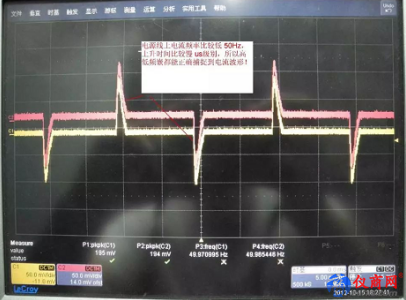 圖7 高低頻捕捉電源線上的電流波形從以上圖片分析,電流大小為1.95A 左右(因為探頭所在量程電流傳輸比為 0.1V/A,由于實測值為 195MV,經(jīng)計算為 1.95A),頻率為 50HZ,兩款探頭實測非接近,也就是在測低頻信號時,看不出差別,都能夠準確的捕捉到電流波形。