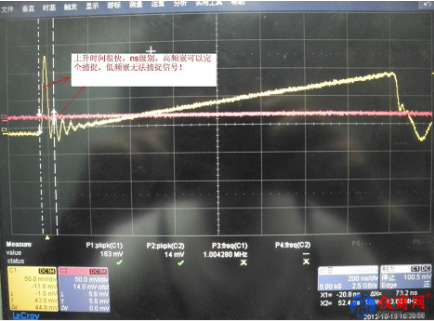 在捕捉 60KHZ 左右的開關(guān)電流波形時,從圖 10 看到,電流波形的上升時間達到 35NS 左右,普通的低頻嵌 CP8100L,帶寬 100KHZ,上升時間 3.5US,遠遠無法滿足要求;高頻電流嵌CP0030A,帶寬 40MHZ,上升時間 8.75NS,滿足實際測量要求。