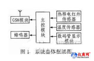 系統(tǒng)基于STC89C52單片機,主要的模塊有熱釋電紅外傳感模塊、溫度檢測模塊、蜂鳴器報警模塊、數碼管顯示模塊和GSM短信報警模塊。系統(tǒng)整體框架如圖1所示。