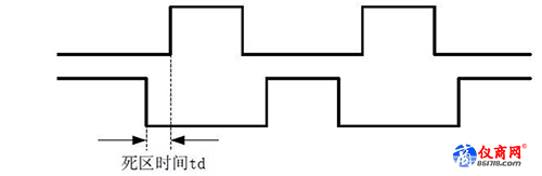 對(duì)于半橋、全橋和LLC諧振等一些H橋或半H橋的拓?fù)潆娫?,PWM的死區(qū)時(shí)間設(shè)定對(duì)電源可靠性至關(guān)重要。實(shí)際上設(shè)定死區(qū)時(shí)間實(shí)則為了避免上、下管直通從而導(dǎo)致電源炸機(jī),也就是說設(shè)定一段上、下管同時(shí)關(guān)斷的時(shí)間,在上管關(guān)斷后延遲一段時(shí)間再導(dǎo)通下管或在下管關(guān)斷后延遲一段時(shí)間再導(dǎo)通上管,如圖5所示td即為死區(qū)時(shí)間。