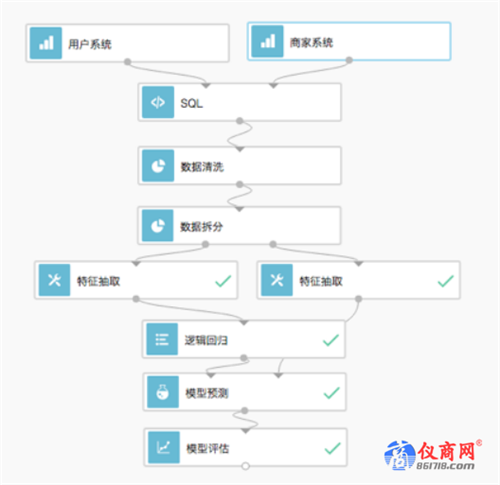 可以看到我們把數(shù)據(jù)引入到系統(tǒng)后,先是用SQL算子對(duì)數(shù)據(jù)做了拼接,然后清洗一些無(wú)效數(shù)據(jù)。 再把數(shù)據(jù)拆分為訓(xùn)練集和測(cè)試集。分別對(duì)兩個(gè)數(shù)據(jù)集做特征抽取。之后訓(xùn)練集傳遞給邏輯回歸這個(gè)機(jī)器學(xué)習(xí)算法進(jìn)行訓(xùn)練。訓(xùn)練之后使用測(cè)試集來(lái)測(cè)試一下模型的效果。大家看到這個(gè)圖了,這是創(chuàng)建一個(gè)模型比較常見(jiàn)的流程。