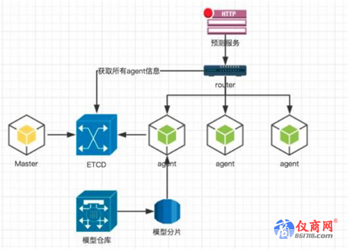 下面一個(gè)場(chǎng)景是預(yù)測(cè)服務(wù)的。預(yù)測(cè)服務(wù)的架構(gòu)一般都滿(mǎn)復(fù)雜的,為了實(shí)現(xiàn)高可用,負(fù)載均衡等目的,所以一般都是標(biāo)準(zhǔn)的服務(wù)發(fā)現(xiàn)架構(gòu)。以etcd這種分布式存儲(chǔ)機(jī)制為載體。 所有的預(yù)測(cè)服務(wù)分別以自注冊(cè)的方式來(lái)提供服務(wù)。