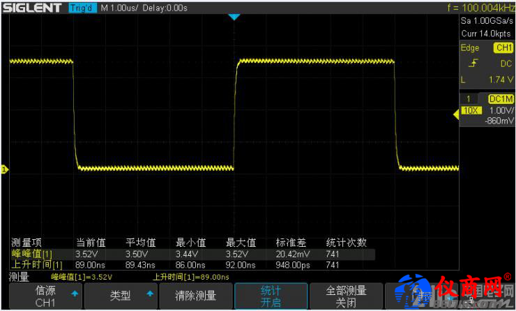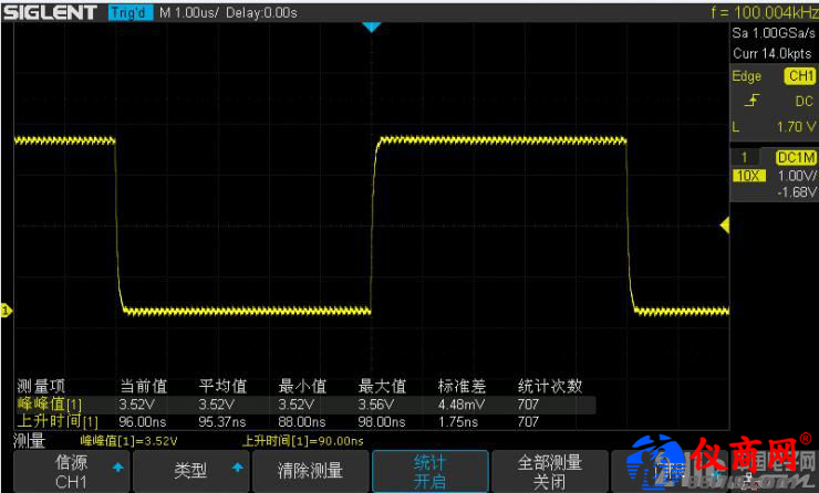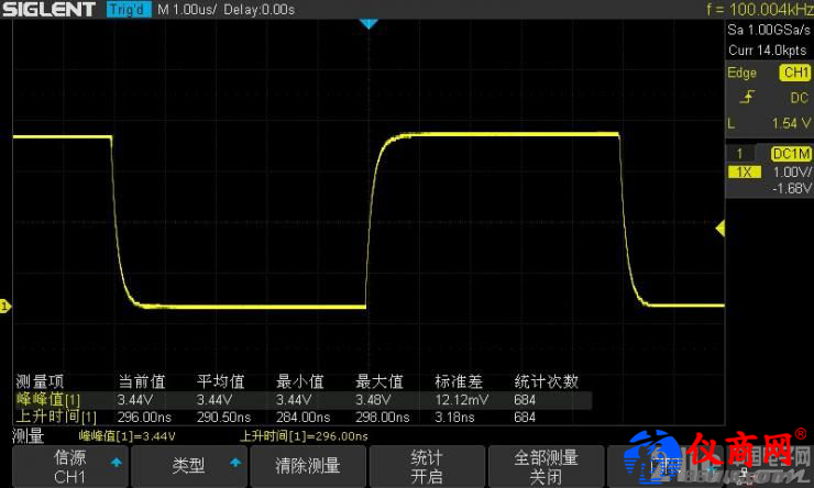 從圖3可以看出在1X和10X的檔位的時(shí)候輸入電容分別是85pF~120pF和18pF~22pF,10X檔位的時(shí)候的輸入電容遠(yuǎn)小于1X檔位。我們可以在SDS1104X-E示波器上的通道1分別測試這兩個(gè)檔位測量同一個(gè)信號(hào)的上升時(shí)間的不同表現(xiàn)(注意:根據(jù)Trise*BW=0.35可以知道100M帶寬對(duì)應(yīng)的上升時(shí)間是3.5ns,PP510無源探頭和100M示波器組成的測量系統(tǒng)的上升時(shí)間為4.94,即測量系統(tǒng)的帶寬為70.85MHz,所以探頭的帶寬越高,系統(tǒng)越接近示波器的帶寬)。無源探頭直接使用配套的鉤子和接地的小夾子,測量鼎陽STB-3實(shí)驗(yàn)板上的一個(gè)100KHz方波的上升時(shí)間,結(jié)果如圖4和圖5所示: