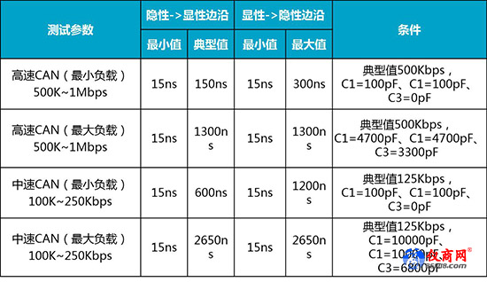 表中根據需求不同,波特率不同分為高速CAN 和低速CAN。測試的是信號邊沿時間,邊沿時間是指隱性電平到顯性電平時間和顯性電平到隱性電平變化的總時間。隱性電平(邏輯值0)到顯性電平(邏輯值1)時間為上升沿,顯性電平到隱性電平為下降沿。