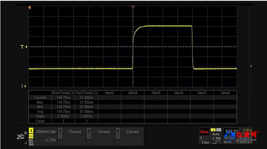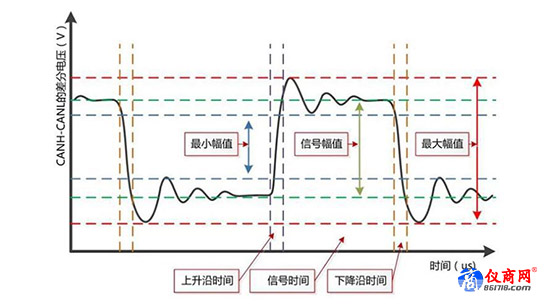 用示波器采集CAN總線波形,設置幅值光標為20%~80%,記錄上升沿的時間、下降沿時間。