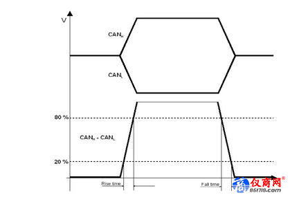 邊沿時間分為上升沿時間、下降沿時間。下降沿時間是按照電壓(20%~80%電壓區(qū)間,有些按照10%~90%電壓區(qū)間測量邊沿時間,文中以20%~80%電壓區(qū)間測量邊沿時間)。表中給出時間范圍,如果超出規(guī)定時間,會造成波形位寬增加,采樣點取值不準確,波特率異常,出現大量錯誤幀,一直重發(fā)數據幀也會造成CAN總線通信癱瘓。