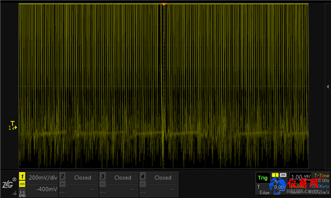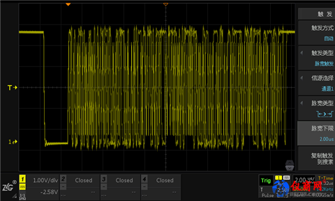 有了上面2個步驟的鋪墊,第3步的設置就變得水到渠成了。我們選用脈寬觸發(fā)->低電平,因為這個波形的毛刺干擾不大,所以觸發(fā)閾值保持不變。點擊示波器面板中的【Run/Stop】使示波器重新開始采集,如圖4,波形已經穩(wěn)定下來,可以做進一步的分析了。