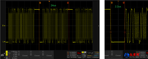 如圖3這是一組連續(xù)發(fā)送的信號,每段長約24us。放大后觀察,每段頭部有大約2.2us的低電平,方波不平坦,但毛刺不高。持續(xù)2.2us低電平是個很好的觸發(fā)點,至此,我們更深入的了解這個信號,現在我們可以確定:信號周期,時基檔位,信號干擾(毛刺,過沖等),可觸發(fā)的特征。