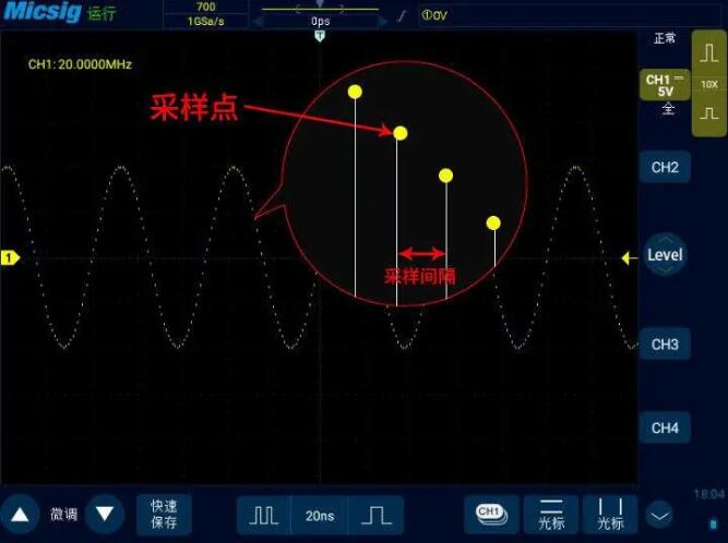 我們通過(guò)探頭給示波器輸入一個(gè)信號(hào),被測(cè)信號(hào)經(jīng)過(guò)示波器前端的放大、衰減等信號(hào)調(diào)理電路后,然后高速ADC模數(shù)轉(zhuǎn)換器進(jìn)行信號(hào)采樣和數(shù)字量化,示波器的采樣率就是對(duì)輸入信號(hào)進(jìn)行模數(shù)轉(zhuǎn)換時(shí)采樣時(shí)鐘的頻率,通俗的講就是采樣間隔,每個(gè)采樣間隔采集一個(gè)采樣點(diǎn)。比如1GSa/s的采樣率,代表示波器具備每秒鐘采集10億個(gè)采樣點(diǎn)的能力,此時(shí)其采樣間隔就是10納秒。