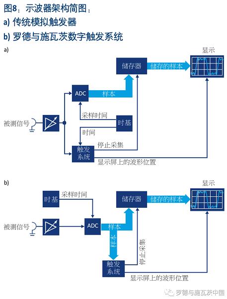 如下圖顯示了采用傳統(tǒng)模擬觸發(fā)器和采用R&S數(shù)字觸發(fā)系統(tǒng)的示波器架構(gòu)之間存在的差異。
