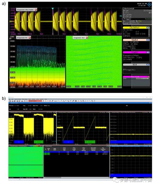 使用a)示波器板載工具和b) VSE進行汽車?yán)走_(dá)信號分析的屏幕截圖