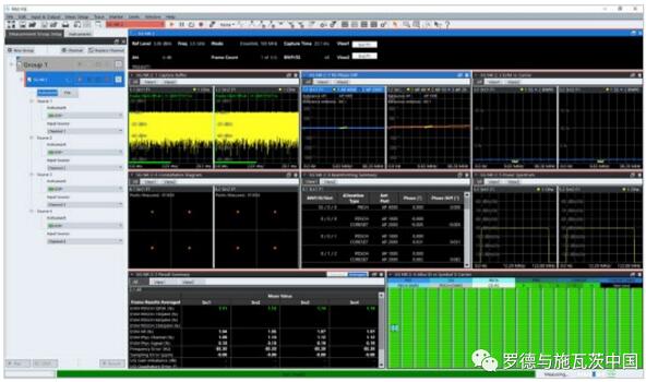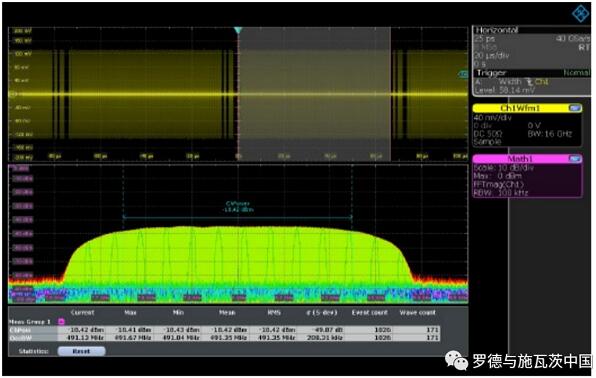 這種方法極大地提升了分析帶寬范圍。舉例來說,使用具有16 GHz帶寬的羅德與施瓦茨(以下簡稱“R&S”公司)的RTP高性能示波器,假設(shè)中心頻率為 8 GHz,將可采集最高16 GHz帶寬的射頻信號,這是傳統(tǒng)頻譜與信號分析儀無法達(dá)到的分析帶寬。