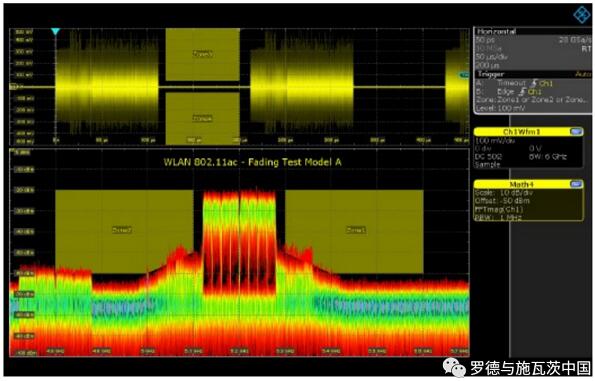 另一個有用的多域聯(lián)調(diào)功能例子是區(qū)域觸發(fā)。使用R&S高端示波器,可在時域和頻域中以圖形方式定義最多八個區(qū)域,并通過邏輯運算符組合來定義條件以及滿足該條件時的示波器的響應(yīng)。這對EMI調(diào)試用途非常有幫助,使用戶可以靈活定義兩個域中的違規(guī)區(qū)域,并在這些區(qū)域發(fā)生違規(guī)時收到警告,即使是短時或間歇性干擾也不例外。如下圖所示,可以結(jié)合兩個域的區(qū)域來定義哪些情況需要檢測對 WLAN信號的衰落效應(yīng)。