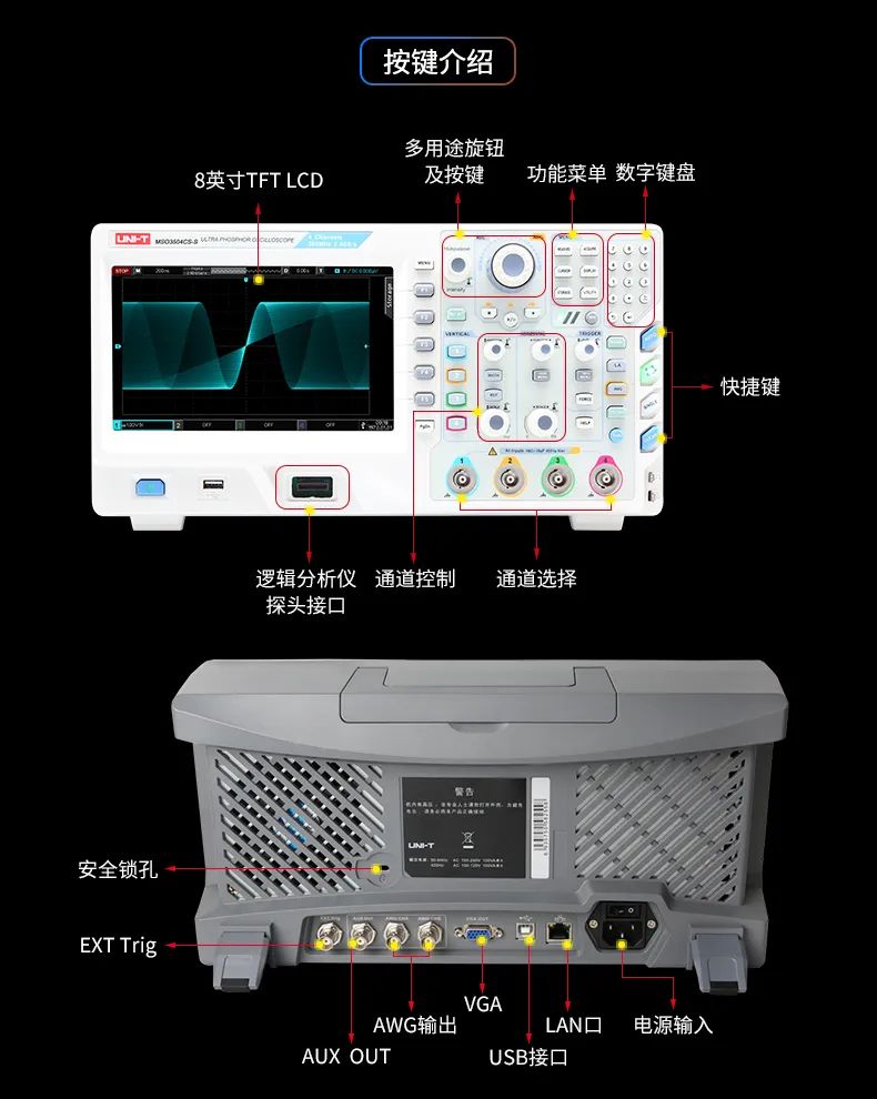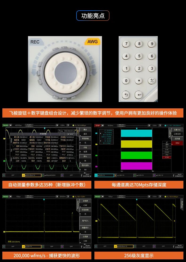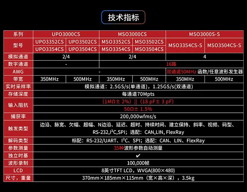 UPO/MSO3000CS、MSO3000CS-S系列采用了UNI-T新創(chuàng)的數(shù)字三維技術(shù)可實(shí)現(xiàn)深存儲(chǔ),高波形捕獲率,實(shí)時(shí)波形錄制/回放功能,多級(jí)灰度顯示等功能,該系列新配置350MHz/500MHz 2個(gè)級(jí)別帶寬,實(shí)時(shí)采樣率高達(dá)2.5GS/s,提供2/4通道共8個(gè)型號(hào),標(biāo)配存儲(chǔ)深度每通道高達(dá)70Mpts,波形捕獲率20萬個(gè)波形每秒,硬件實(shí)時(shí)波形不間斷錄制和波形分析功能支持錄制不低于8萬個(gè)波形,多達(dá)256級(jí)的灰度顯示。