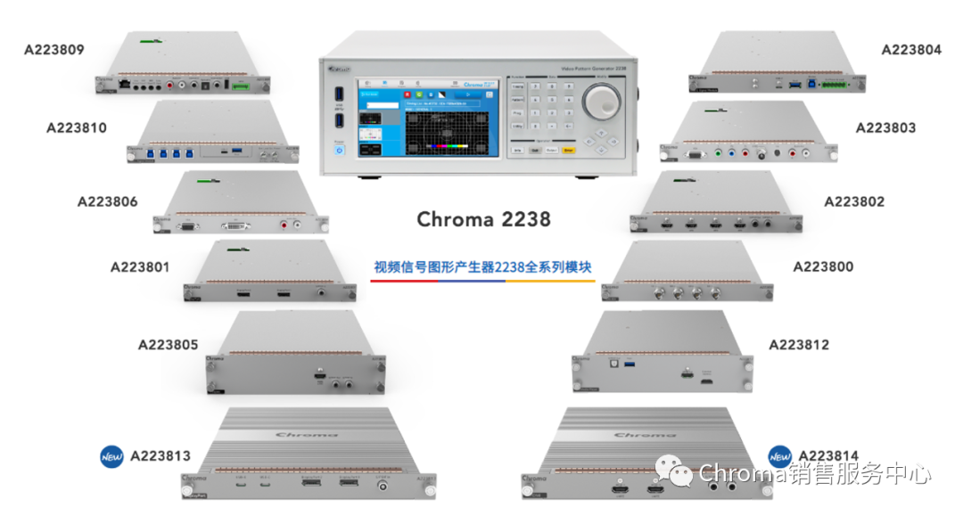 Chroma 2238提供HDMI、DisplayPort、USB-C、12G-SDI、Analog及DVI等12種高效能可替換式的信號模塊,最高可搭載4臺信號模塊同時輸出(Multi-Out)功能,各信號模塊具備獨立內建高速繪圖核心處理器,可同時輸出不同分辨率 (Timing) 與測試圖形 (Pattern),超高分辨率圖像切換時間僅需200 ms (8K為例),使用者可依據(jù)檢測應用,選擇最合適的組合方案。