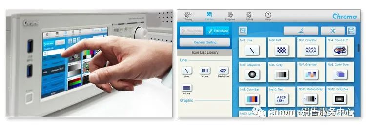 Chroma 2238具備直觀易懂的圖形化人機操作接口,7寸觸控大屏幕,提供直覺且彈性操作方式,并支持實時預覽輸出圖形(Instant Pattern View)功能,用戶可直接于本機上瀏覽、編輯測試圖形立即輸出,除了內建觸控式鍵盤設計,亦可透過USB接口連接外購的輸入設備 (如鍵盤、鼠標),提供多元及便利性的操作方式。