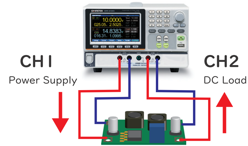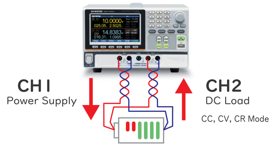 GPP-x323系列是一款多通道輸出電源,它不僅具有高回讀分辨率(0.1mV/0.1mA)和瞬態(tài)響應(yīng)時間≤50μs的特點, 而且通道1和通道2內(nèi)置有電源及負(fù)載功能。可以按需要切換為電源輸出或者負(fù)載模式。一臺電源即可滿足基本的電池充放電測試。根據(jù)DUT的耗電情況,可以設(shè)置GPP-x323通道2的放電電流,并根據(jù)電池充電規(guī)范設(shè)置通道1的輸出電壓和輸出電流。GPP-x323無需配置電子負(fù)載,即可實現(xiàn)簡單的充放電試驗。試驗可在有限的試驗場地進(jìn)行,并可降低試驗設(shè)備的采購成本。