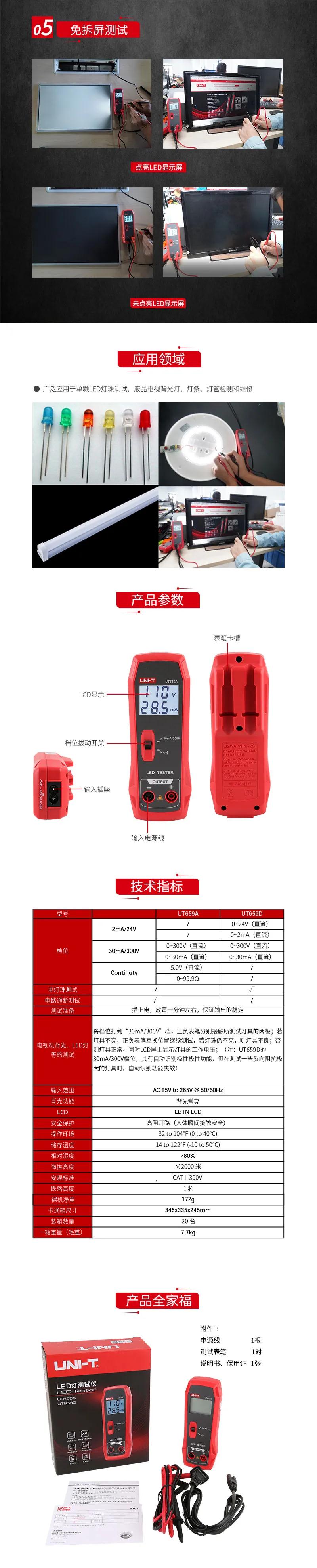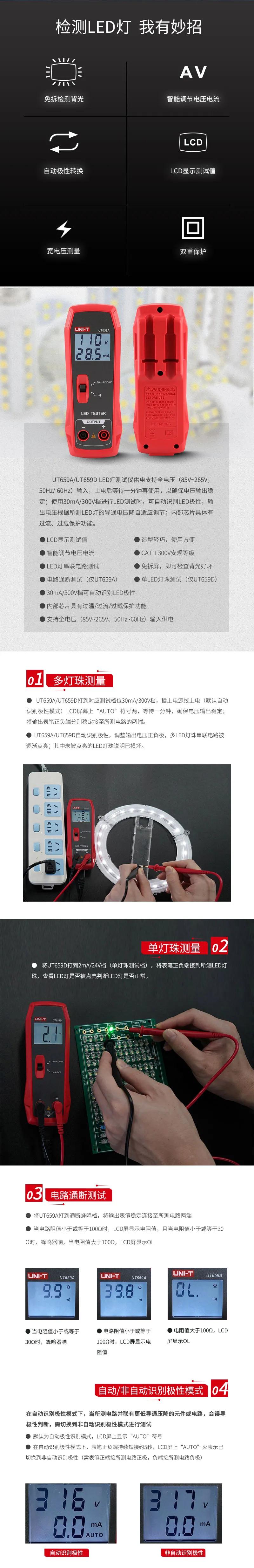 優(yōu)利德UT659A/UT659D LED燈測試儀供電支持全電壓(85V~265V,50Hz/ 60Hz)輸入,上電后等待一分鐘再使用,以確保電壓輸出穩(wěn)定;使用30mA/300V檔進行LED測試時,可自動識別LED極性,輸出電壓根據(jù)所測LED燈的導(dǎo)通電壓降自適應(yīng)調(diào)節(jié);內(nèi)部芯片具體有過流、過載保護功能。