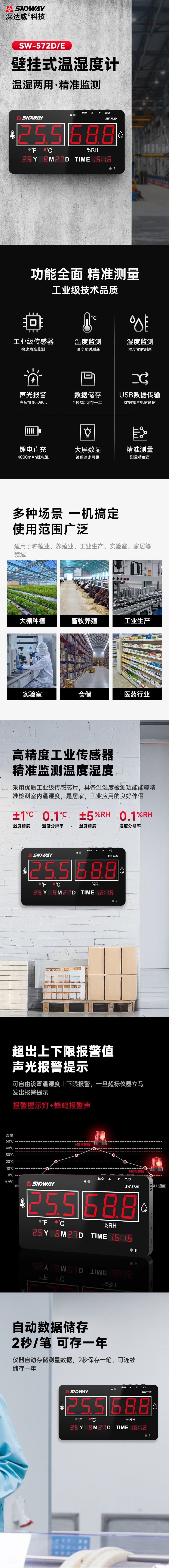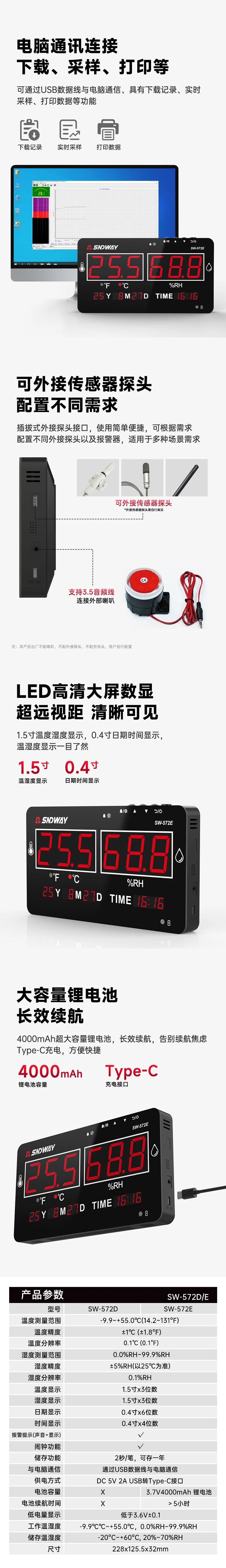 在功能方面,SW-572E支持用戶自定義溫濕度報(bào)警上下限,超出設(shè)定范圍時(shí)可觸發(fā)聲光報(bào)警。設(shè)備具備自動(dòng)數(shù)據(jù)存儲(chǔ)能力,每2秒記錄一次數(shù)據(jù),最多可連續(xù)存儲(chǔ)一年。通過(guò)USB Type-C接口,用戶可連接電腦進(jìn)行數(shù)據(jù)下載、實(shí)時(shí)采樣或打印,也可外接傳感器探頭及報(bào)警器,擴(kuò)展監(jiān)測(cè)場(chǎng)景。