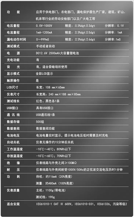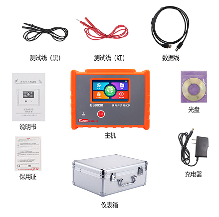 ES9030漏電開關(guān)測試儀,主機、監(jiān)控軟件、測試線、通訊線等組成。具有充電功能無需現(xiàn)場找電、全彩大屏LCD顯示,一了然,觸屏操作方便易用。大容量存儲500組數(shù)據(jù),電壓測量范圍:0.0V-1000V,測量精度:±3%DGT ±3DGT.測試電流從1 ~ 1200MA連續(xù)可調(diào),測試漏電流動作時間量程為0 ~ 999MS。上位機軟件具有歷史數(shù)據(jù)讀取、查閱、保存、報表等功能。