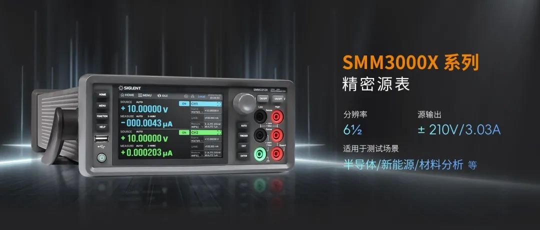 2025年2月18日,鼎陽科技推出全新一代精密源表SMM3000X系列,此系列產(chǎn)品具備6?顯示位數(shù),高達±210V直流電壓、±3.03A直流電流、±10.5A脈沖電流輸出,最小10fA/100nV編程及測量分辨率,最大采集速率100,000 points/s。支持四象限操作,能夠同時采集和測量信號,實現(xiàn)對DUT的源-測量循環(huán)。既可作為恒壓源、恒流源、電壓表、電流表和歐姆表,還可以作為脈沖發(fā)生器、波形發(fā)生器,是測試半導(dǎo)體和其他非線性設(shè)備和材料的理想選擇。